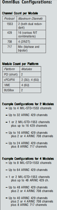 附加功能:IRIG电路允许通道、板卡和其他设备与标准时钟时间同步。IRIG时间可以来自外部源,也可以由OmniBus模块生成。所有模块都有各种数字输入和输出信号。OmniBus产品适用于工业温度。商用温度版本是标准配置。软件:使用OmniBus产品的最简单方式是通过CoPilot®,这是Ballard基于Windows®的软件(可单独购买)。因为COPilot可以承载多个卡、通道和数据总线(如MIL-STD-1553、ARINC 429和ARINC 708),是OmniBus的理想工具。CoPilot自动检测、工程单位转换等功能提高了用户生产力。CoPilot的Plus版本增加了图形显示、强大的脚本引擎以及软硬件回放功能。此外,软件开发者可以使用附带的应用程序接口(API)快速开发定制应用程序。尽管OmniBus产品只需少量API调用即可轻松配置和运行,但其全面的库中包含了一系列针对特定需求的工具。驱动程序软件适用于Windows®95/98/NT/Me/2000/ XP。如需获取其他操作系统(Linux、VxWorks®等)的驱动程序,请联系Ballard Technology的客户支持以获取订购信息。订购信息请联系Ballard Technology的客户支持以获取OmniBus产品的订购信息。